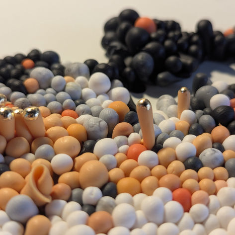 Ensemble, l’expression devient une terre recomposée, hybride, à la fois naturelle et artificielle, où se tissent des liens, des réseaux de mémoire et de matière. L’œuvre se déploie selon une grammaire sérielle où l’unité élémentaire, la “perle”, constitue le module de base d’une structure accumulative.